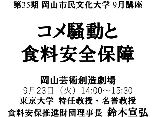 9月23日(火・祝)講座の講師は東京大学大学院特任教授、農業経済学者の鈴木宣弘氏。「コメ騒動と食料安全保障」をテーマにご講演いただきます。質疑応答「あり」の予定。