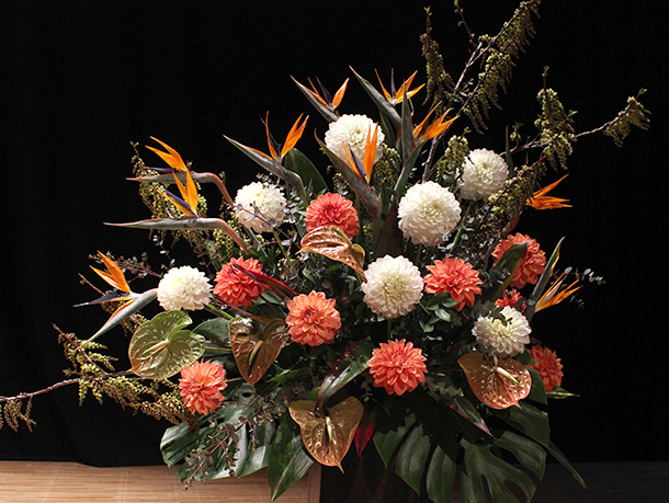 舞台を装飾してくださる花は、高松市片原町にあります『柏原生花店』さん。この素敵な花を花束にして講演後3名の方に、抽選でプレゼントをしています。