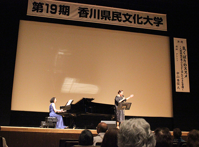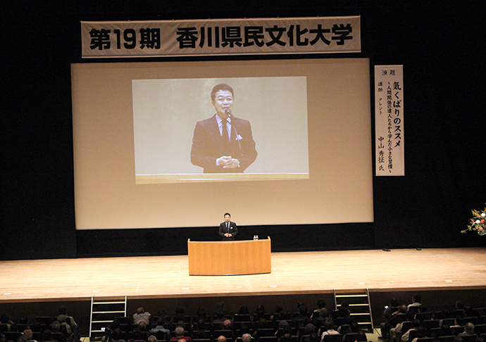 さて、第1回3月の講座にご登壇いただいたのは、タレントの中山秀征先生でした。テーマは『気くばりのススメ〜人間関係の達人たちから学んだ小さな習慣〜』でした。故志村けんさんの貴重なお話も聞け、質疑応答では質問してくれた会員様に、ステージで直接サイン色紙をプレゼントしてくれました。