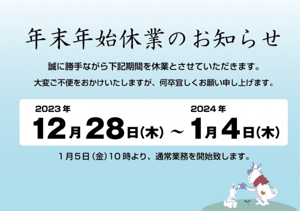 トップページ > お知らせ一覧 > 年末年始 休業のお知らせ